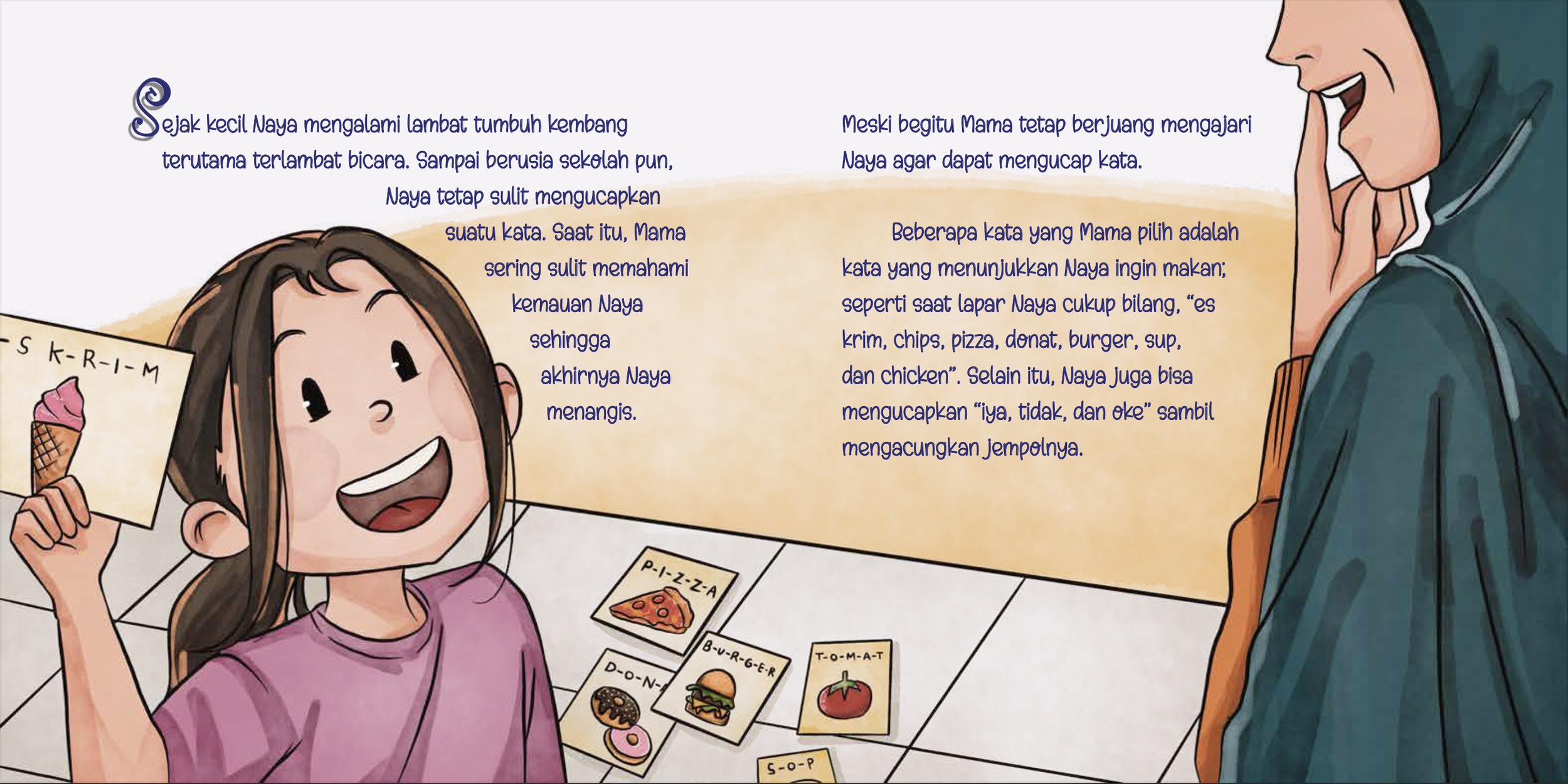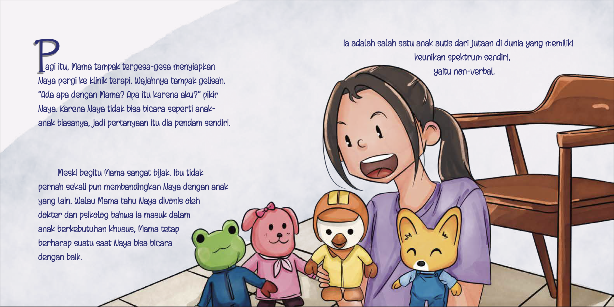 Buku ini bercerita tentang kreativitas dan kegigihan belajar Naya, serta inovasi komunikasi alternatif agar membuat dunia semakin inklusif kepada anak-anak autis yang non-verbal atau dengan mutisme selektif.